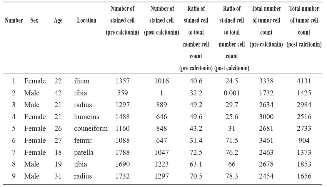 There are 4 male and 5 female were included in this study, total number were 9 patients. Mean age was 25 years, ranged 18-24 years. Tumor locations were shown in Fig. 2. Number of stained positive mononuclear spindle cells decreases significantly after calcitonin administration in the same patient (P-value 0.05). Ratio of stained positive cells to total cells decreases without statistically significant after calcitonin administration. Total number of tumor cell decreases without statistic significant after calcitonin administration. Number of stained positive Giant cell group can not be evaluated due to very little number of staining cell.