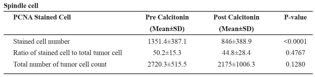 Table 2 showing means of number of positively stained mononuclear spindle cells before and after calcitonin administration Spindle cell
