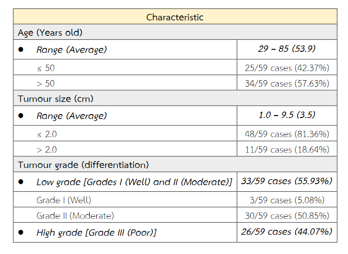 The formalin-fixed, paraffin-embedded (FFPE) tissue blocks from 59 patients with primary breast cancer stored in the Army Institute of Pathology, Bangkok, Thailand were recruited in this study. The breast cancer tissues were diagnosed between 2009 and 2018 and already had their ER, PR, HER2 and Ki67 immunostainings. The selective criteria included infiltrating ductal carcinoma (IDC) of no special type (NST) of the breast with metastasis to axillary lymph node (s). The characteristics of 59 breast cancer samples are shown in Table 1.