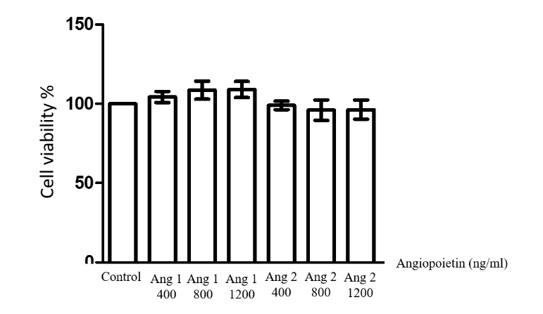 Cells were treated with three concentrations of Angpt1 and Angpt2 (400, 800 and 1,200 ng/mL) for 1 hour before measuring cell viability using MTT assay. The result showed that there was no significant difference between the number of cells treated with Angpt1 and Angpt2 at every concentrations and that of the control group (Figure 1). Therefore, these nontoxic concentrations of Angpt1 and Angpt2 were chosen to use in the subsequent experiment.