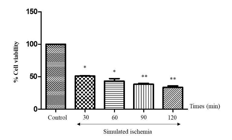 Figure 2 Determination of H9c2 cell viability after simulated ischemia at different durations (30, 60, 90 and 120 minutes). The results are expressed as mean ± standard error. Three experiments with independent cell preparations were performed.