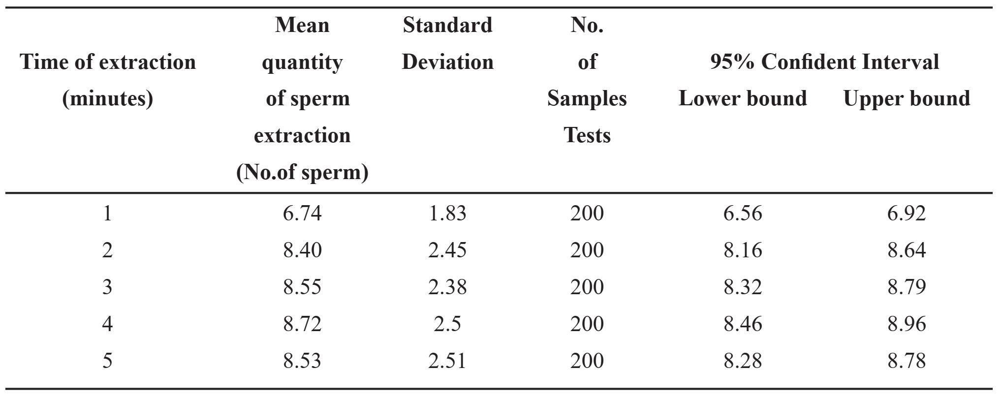 1. The mean quantity of sperm extracted in one minute, from Table 1, was markedly different from those extracted in 2, 3, 4 and 5 minutes. So, we couldn’t use one minute as optimal time for testing.