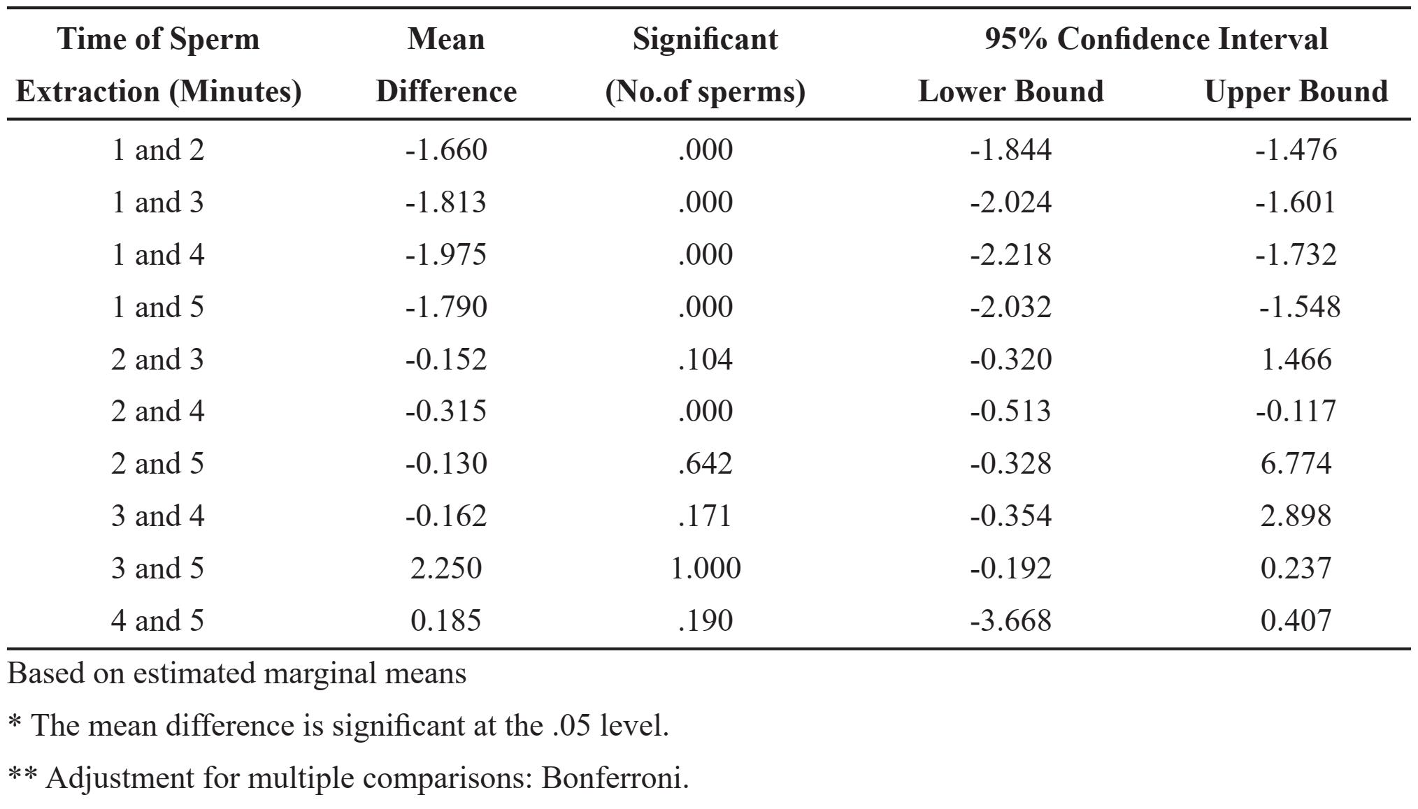 Table 2. Pairwise comparisons of number of sperms extracted by various time (minutes), finding the optimal time of shaking.