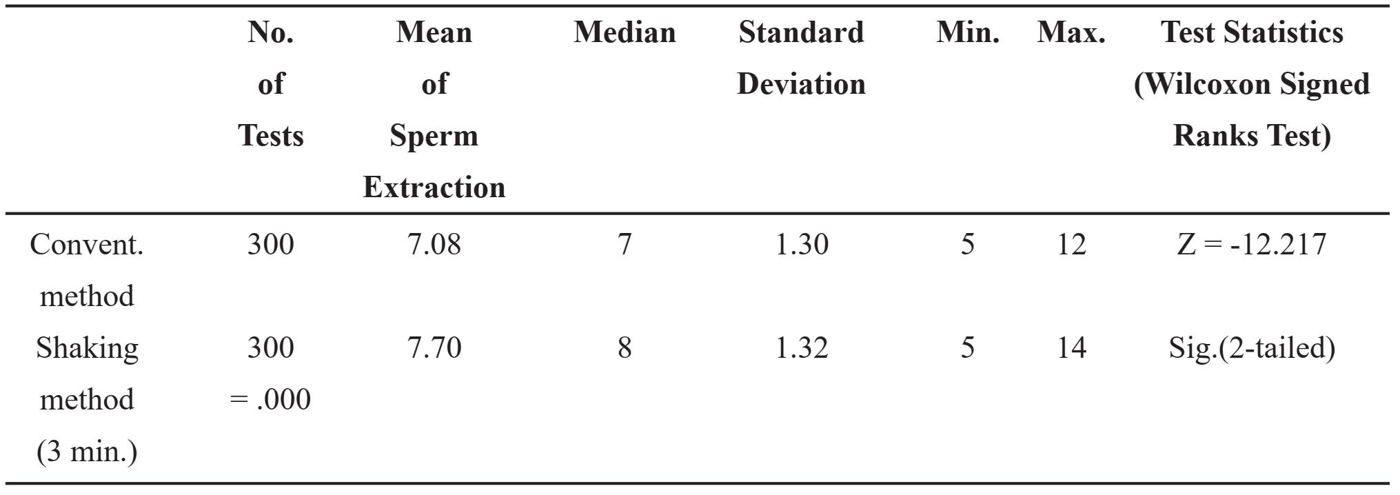 3. The results of sperm extraction compared between shaking method by mixer and conventional method were significantly different (p<.001, Table 3). This meant that the shaking method was better than the conventional method for sperm extraction
