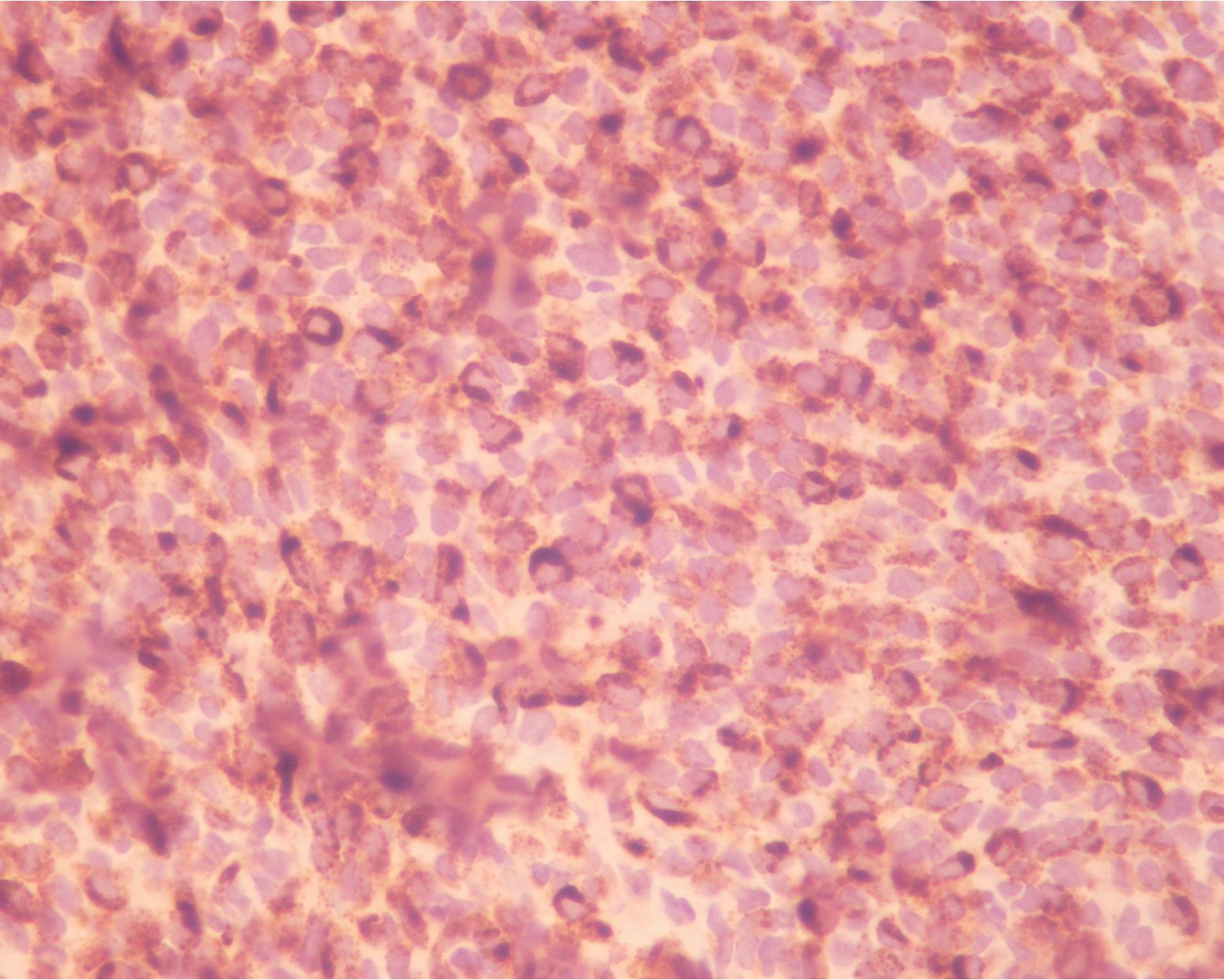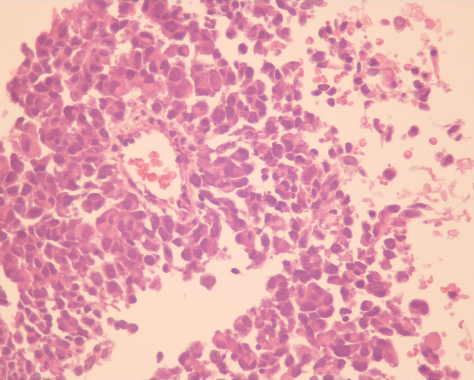 Figure 1 The tumor cells mimicked plasma cells showing eccentric round nuclei with indistinct nucleoli and moderate amounts of eosinophilic cytoplasm, arranged in loosely cohesive sheets.
